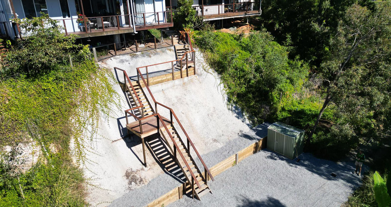 Tiered Access Decking & Retaining Project Location: Brisbane, Australia Tags: Accessibility; Decking; Structural Works; Residential
